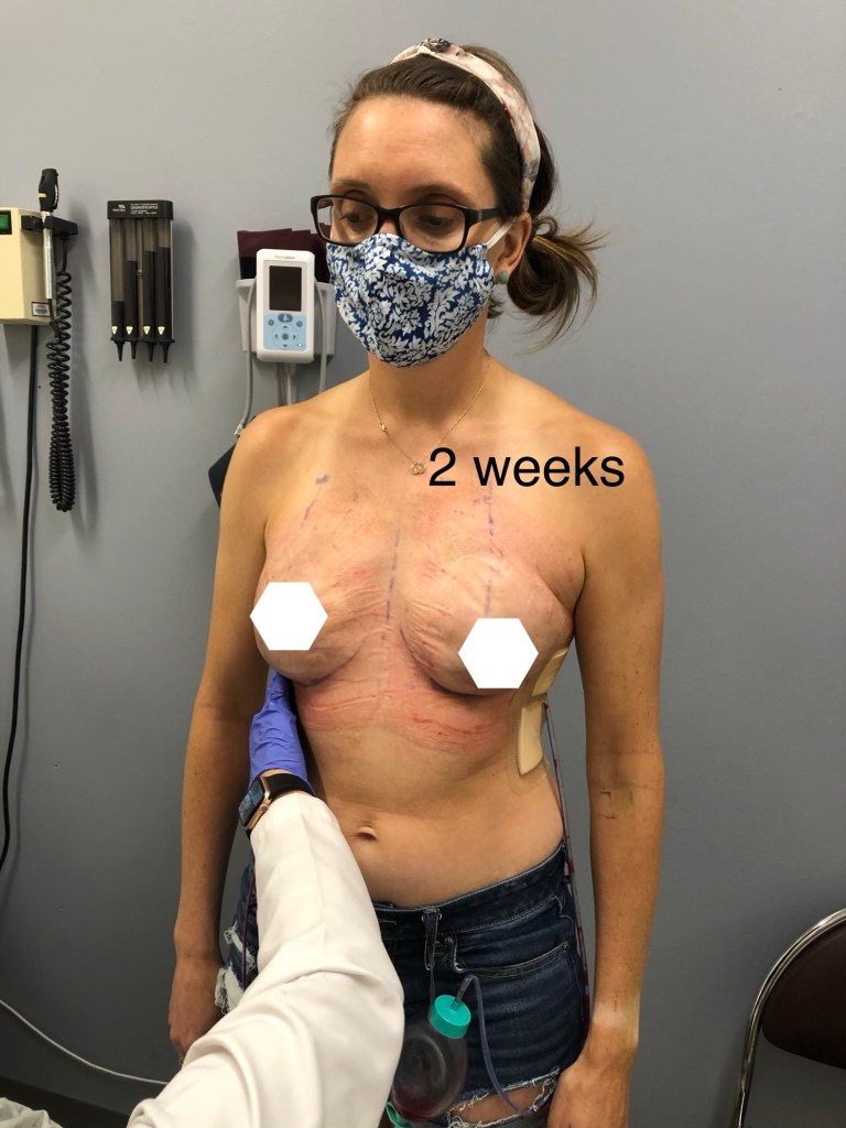 This is two weeks post-op, removal of the pump and two of the drains (there were four). The boobs ended up filling up and not being so ripply.