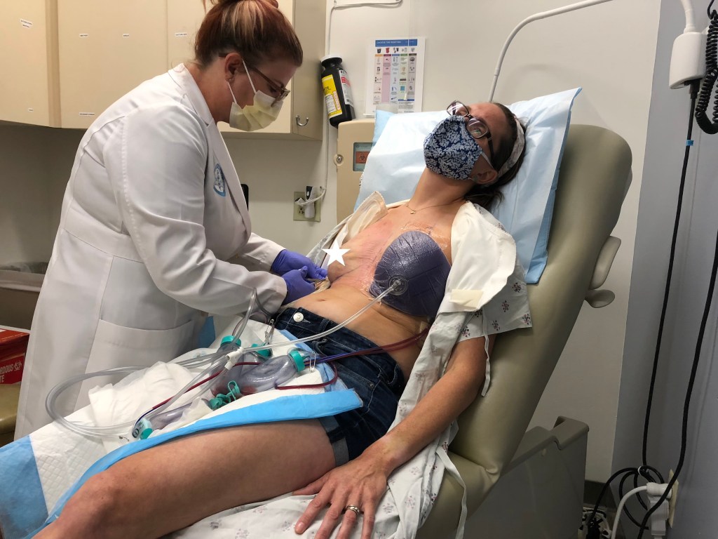 For two weeks I had my normal drains and then another pack on me that stimulated the tissue to grow, these were like huge adhesive pads stuck to my chest with a little energy pack attached. So there were a lot of wires and tubes to be worried about. Don’t worry about the drains, they are REALLY hooked in there. I figured maybe they were in a couple inches…. try like 6 inches! When they removed them it was insane. So after seeing that I realized I can move the arms more and that the drains are not going to “fall” out.